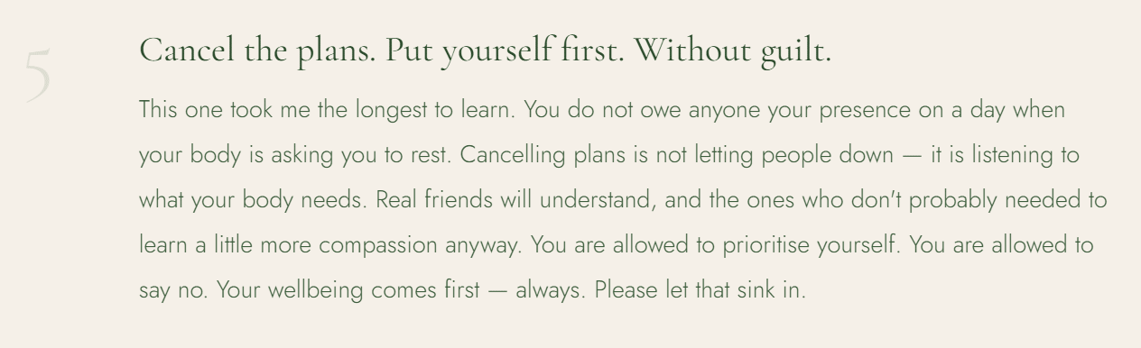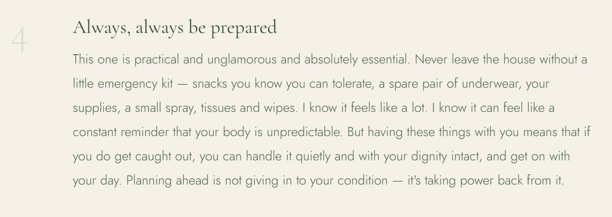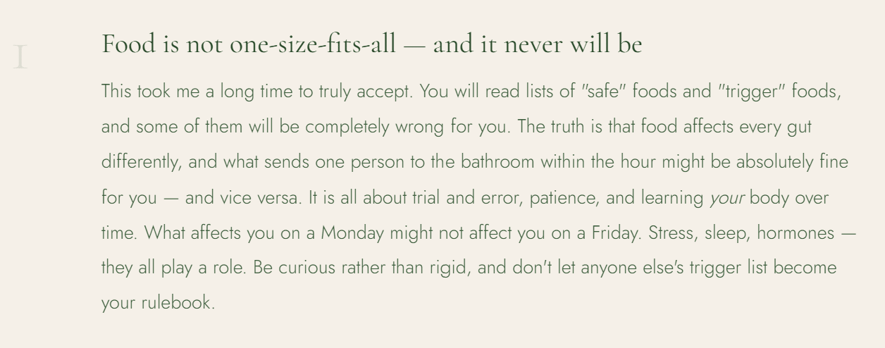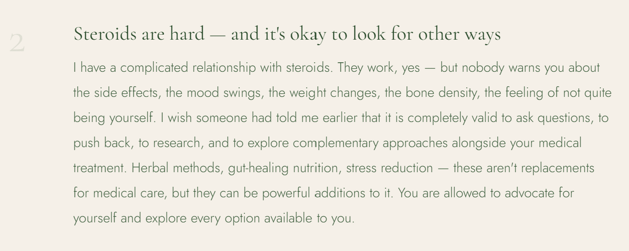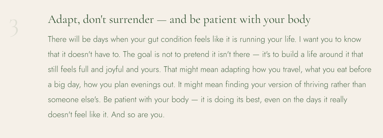 When I was diagnosed, I was handed a lot of medical information and very little of the real stuff. The practical stuff. The human stuff. The things you only learn after years of living in a body with a gut condition. So here are five things I genuinely wish someone had sat me down and told me. I hope they help you. I could write fifty of these and I probably will, over time. But these five feel like the ones I needed most at the beginning. I hope they land for you wherever you are in your journey. 🌿 With love |