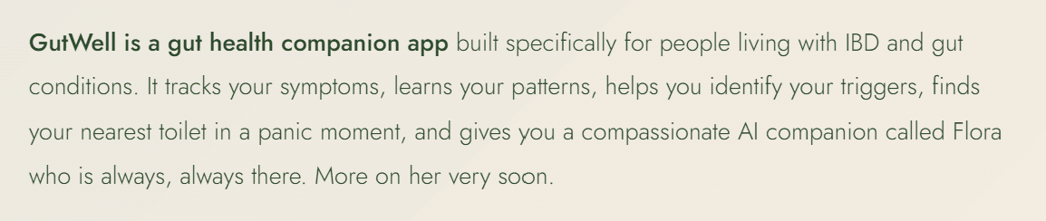So I built it. I was diagnosed with a gut condition decades ago, at a time when the conversation around IBD was very different to what it is today. There wasn't much support, there wasn't much understanding, and there certainly wasn't a compassionate, intelligent companion sitting in your pocket helping you make sense of what your body was doing. There was just me, figuring it out. Day by day, flare by flare, appointment by appointment. "I know the overwhelm of a new diagnosis. The exhaustion of tracking everything. The loneliness of a condition most people can't see." I know what it's like to plan every outing around where the nearest toilet is. I know the anxiety of eating something new and wondering whether today is the day it turns on you. I know the grief of cancelling plans, the fatigue that goes unexplained to people who don't live in this body, and the frustration of feeling like the medical system doesn't quite have enough time for all of it. I built GutWell because I wanted something better to exist, for me, and for the hundreds of thousands of people in the UK living with IBD right now. This newsletter is where I'll share everything I've learned across 30 years of living with a gut condition, the honest stuff, the practical stuff, the stuff nobody tells you at diagnosis. Tips from my own experience, updates on the app, and a space where gut health is talked about openly and without shame. Because we deserve that. All of us. I'm so glad you're here. Welcome to the GutWell community, you are not alone in this. 🌿 With love Founder of GutWell · IBD warrior for 30 years · building the app I always needed. |