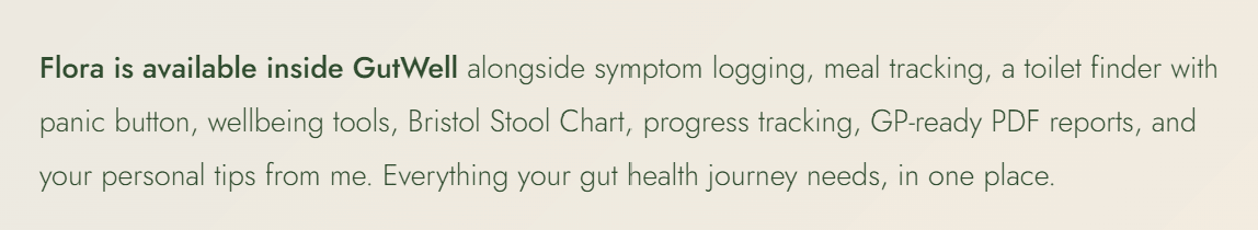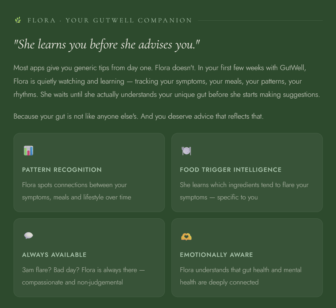 When I was building GutWell, I knew I wanted it to be more than a tracker. Anyone can build a tracker. What I wanted, what I had always wanted, was something that felt like a companion. Something intelligent and warm that actually understood what living with a gut condition feels like day to day. That's how Flora was born. Flora is named for your gut flora — the ecosystem living inside you that influences so much more than most people realise. Flora is GutWell's AI companion, and she is unlike anything else I've seen in a gut health app. Here's what makes her different. One of the things I'm most proud of with Flora is her design philosophy, she tracks before she advises. She won't bombard you with suggestions before she's learned your patterns. That felt important to me, because gut health is genuinely complex and individual. A blanket recommendation can do more harm than good. Flora is there for the hard days when you just need to feel understood. She's there for the curious days when you want to understand what's going on in your body. And she's there for the good days too, because celebrating progress matters just as much as managing symptoms. I can't wait for you to meet her. 🌿 With love |