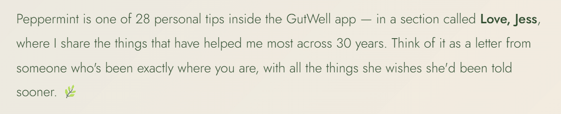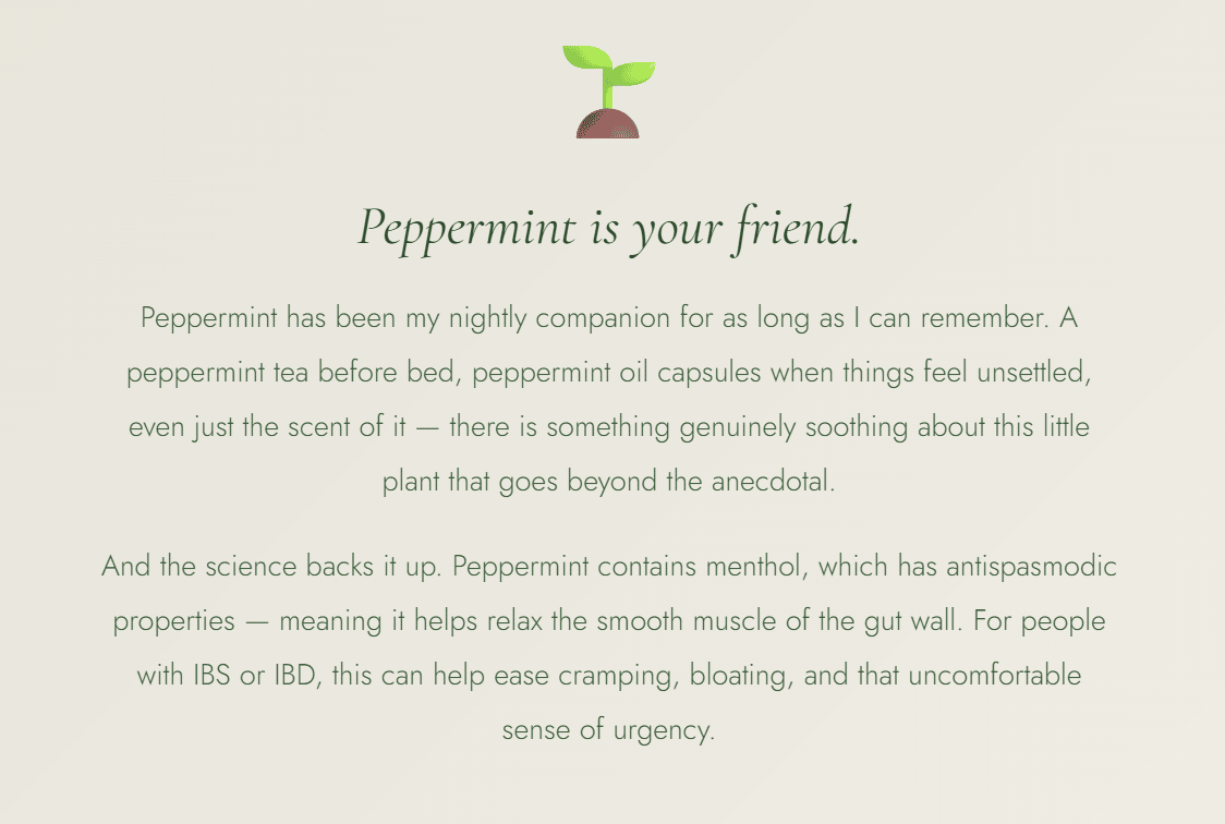 Welcome to Love, Jess, a little series where I share the tips, remedies and everyday wisdom I've gathered across 30 years of living with a gut condition. These aren't medical prescriptions. They're the things that have genuinely helped me, the things I reach for, the things I wish someone had passed on earlier. And I'm starting with my absolute favourite. How I use it: My nightly ritual is a cup of peppermint tea about an hour before bed. It helps my gut settle and signals to my body that the day is winding down. On harder days, when bloating is bad or cramps are nagging, I'll reach for enteric-coated peppermint oil capsules, which are designed to release in the intestine rather than the stomach. If you haven't tried them, they're worth looking into. Talk to your GP or pharmacist first, especially if you're on medication, but for many people with gut conditions, peppermint oil capsules can make a real difference. "It's the remedy I've come back to again and again across three decades. Simple, natural, and genuinely helpful." ๐ต Peppermint tea: morning or evening, as a gentle daily ritual. Look for a good quality loose leaf or a brand with high peppermint content. I hope this one helps you as much as it's helped me. More tips coming soon, this is just the beginning. With love |